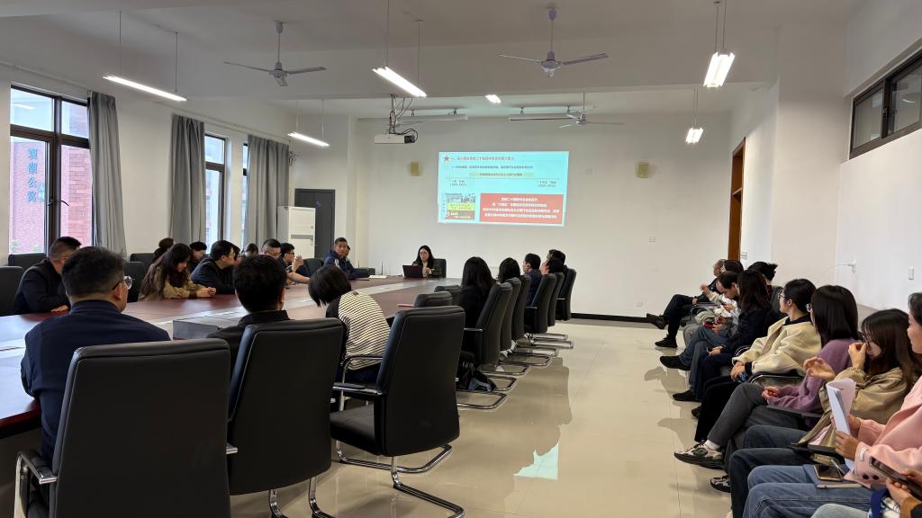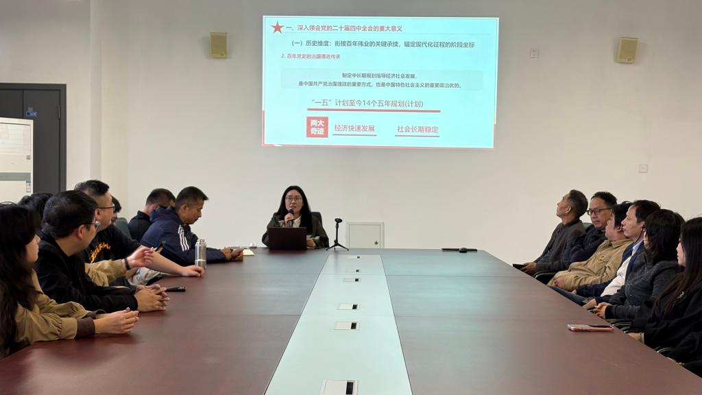 党的二十届四中全会是在“十四五”主要目标任务即将圆满完成、迈向2035年基本实现社会主义现代化关键节点召开的一次重要会议,为我国未来五年乃至更长时期的经济社会发展描绘了宏伟蓝图。为深入学习贯彻全会精神,切实将全院教职工的思想和行动统一到党中央的决策部署上来,推动全会精神与学院教育教学、学科建设的深度融合,11月12日下午,设计与数字艺术学院在C310会议室举办了专题学习活动,特邀人文学院贾永琪老师作题为“深入学习贯彻党的二十届四中全会精神——奋进新征程,擘画新蓝图”的专题辅导报告。学院党总支书记潘修强主持了此次学习活动,全院教职工参加。