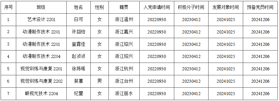 根据《中国共产党发展党员工作细则》有关规定,经设计与数字艺术学院学生第一党支部、第二党支部研究,拟将白可等七名同志转为中共正式党员,现将有关情况予以公示。在公示期限内,欢迎广大党内、外群众通过信函、电话或直接反映等方式予以监督,以个人名义信函反映问题提倡署真实姓名。